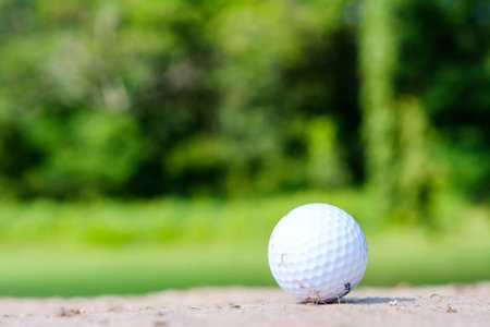 Golf ball in mid-air after being struck by a driver. golf ball sand pit