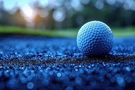 A beautiful close-up image of a golf ball resting on green grass, illuminated by a warm sunset glow, creating a serene outdoor atmosphere perfect for leisure activities.