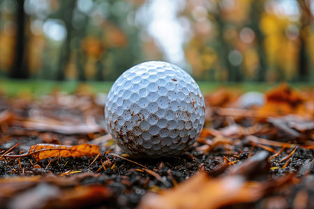 A close-up view of a golf ball resting on grass, complemented by a golf club in the background, showcasing a serene autumn setting.