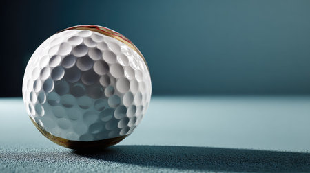 Stylish golf ball isolated on empty dark blue background, close up shot with blank space for text.