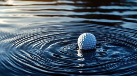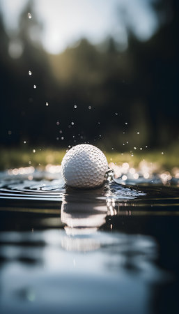 A golf ball is in the water, with water droplets surrounding it. Concept of motion and action, as if the ball is in the midst of a swing or a shot