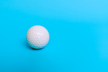 A solitary white golf ball rests against a vibrant blue backdrop, casting a distinct shadow that highlights its texture and form, ideal for sports themes.