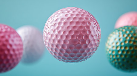 Pastel golf balls float on a serene blue background, creating a fun vibe.