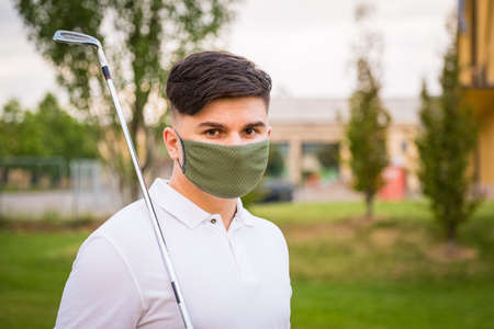 Young boy with golf club stick on green field with protective masks