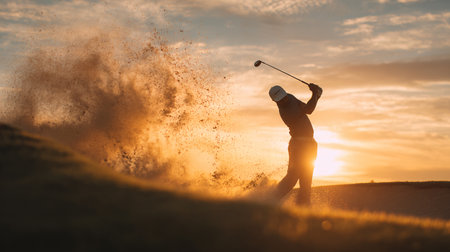 golf player shot ball from sand bunker at course with beautiful sunset with sun flare