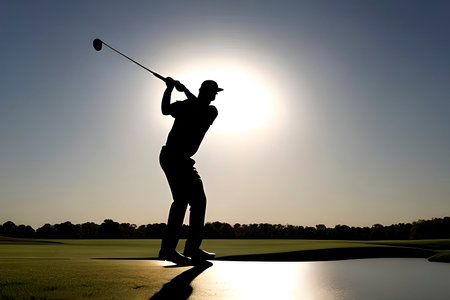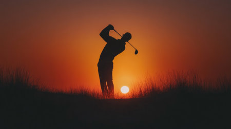 Golf swing silhouette captured at dusk with scenic course backdrop and fading sun