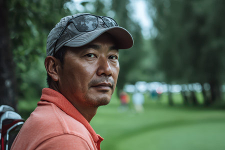 Asian man enjoying a summer day on a golf course, taking a moment to relax amidst the lush greenery and vibrant atmosphere of outdoor golfing