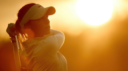 A young woman is captured swinging a golf club at sunset, creating a stunning silhouette against the golden light. The moment embodies energy and focus, showcasing both the beauty of nature and the spirit of sports.