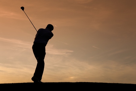 Senior man playing golf - pictured as a silhouette against an evening sky