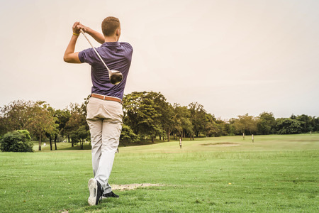 Male golf player on professional golf course. Taking a shot.