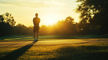 Silhouette of a golfer enjoying a sunset on a golf course.