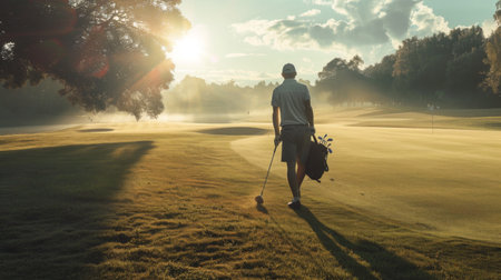 A male golfer playing golf on the course at sunset. Generative Ai
