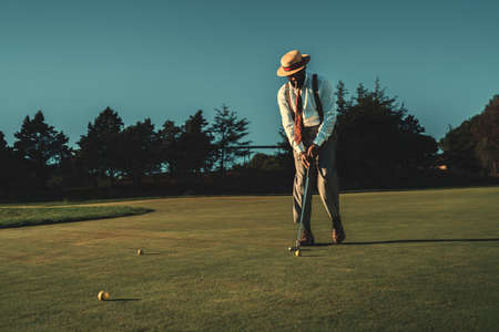 View of a fancy mature African guy in an elegant retro outfit with a straw hat and a tie hitting the ball with a club while standing on the lawn of the private golf club on a warm sunny evening