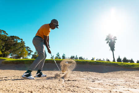 Side view of african american young man hitting with golf club on sand against clear sky at course. summer, copy space, golf, unaltered, nature, sport and weekend activities concept.