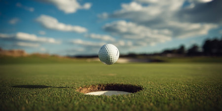 A stunning close-up image of a golf ball poised on the edge of a hole on a green, with warm, soft lighting highlighting the morning atmosphere.
