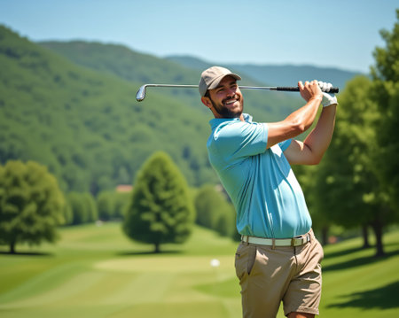 A golfer enjoys a sunny day, swinging his club with a smile amid the tall trees and rolling hills of a beautiful golf course, showing a perfect outdoor experience.