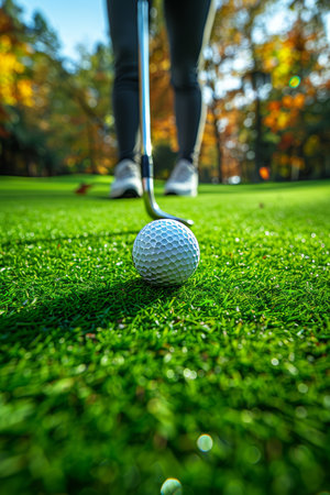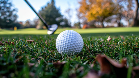 A close-up view of a golf ball resting on grass, complemented by a golf club in the background, showcasing a serene autumn setting.