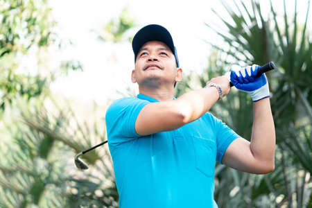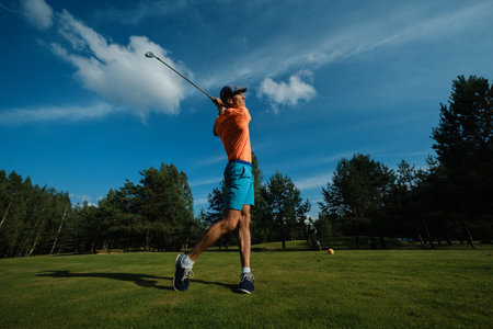 Golf player taking a shot on golf course with golf club