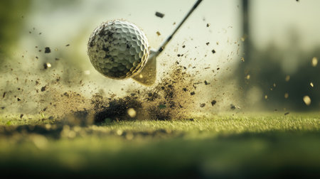 A stunning close-up image capturing the moment a golf ball soars into the air, surrounded by an explosion of grass and soil dust, evoking the thrill of the game.