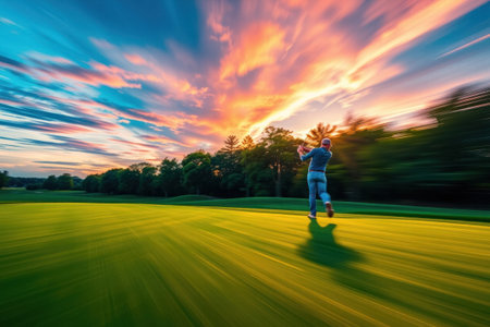 Blurred golfer playing golf in the evening golf course, on sun set evening time. Man playing golf on a golf course in the sun.