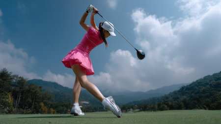 Close up view of a professional woman golfer in sportswear actively playing golf on the course