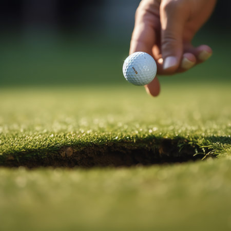 A close-up view of a golf ball resting near the hole on a well-maintained green, highlighting the lush grass and depth perspective, ideal for sports enthusiasts.