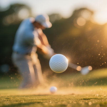 Golfer executing a powerful swing, sending a golf ball soaring through the air on a vibrant green course, with sunlight creating a dynamic atmosphere