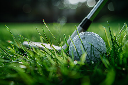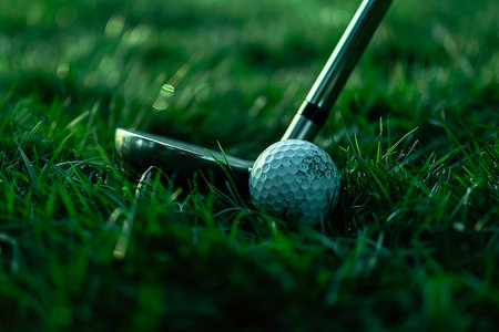 A golf ball sits near a golf club on a green grassy field. The scene has a shallow depth of field, with the ball and club in focus. The color palette consists of greens and browns. The image could be used for sports, leisure, or recreational purposes.