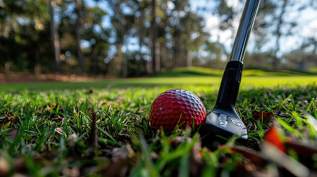 A vibrant scene capturing a golf ball in vivid detail next to a putter on lush green grass, ideal for showcasing outdoor sports and recreation activities.