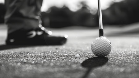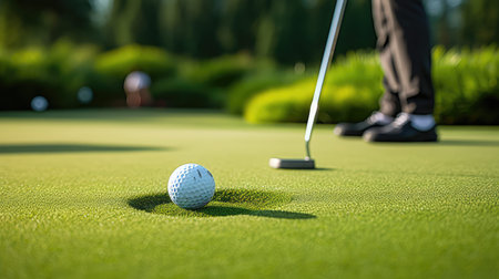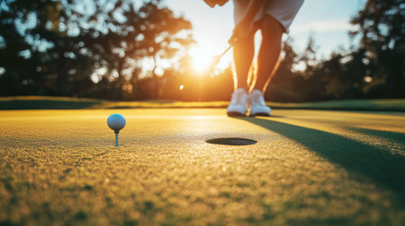 A golf ball rests on a manicured green, with a golfer positioned in the soft-focus background. The shot captures the texture of the grass and the morning sunlight. The composition may be suitable for promotional materials related to sports, leisure activities, or outdoor events.