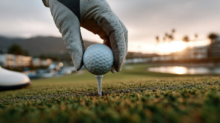 A close-up view of a hand in a golf glove carefully placing a golf ball on a tee as the sun sets over a scenic landscape. The tranquility of the moment captures the essence of the sport.