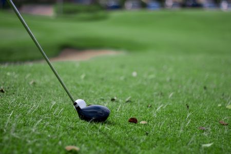 close-up of golfer mid-swing, with t club and ball sharply at green course background