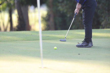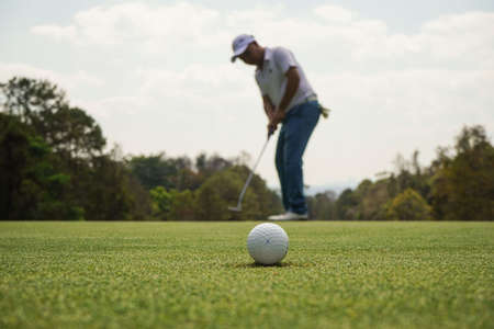 Golf player at the putting green. Hitting ball into a hole