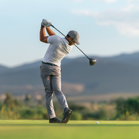 A dedicated golfer prepares to tee off on a vibrant green fairway, showcasing focus and technique amidst a beautiful landscape and golf cart nearby.