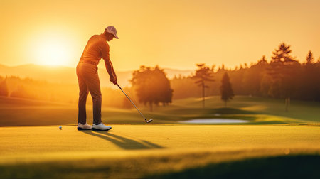 Golf player on golf resort field on training his skills playing golf on summer evening.AI Generative.