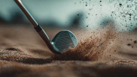 This dynamic close-up captures a golf club striking sand in a bunker, showcasing the action of the sport with flying particles and a blurred background.