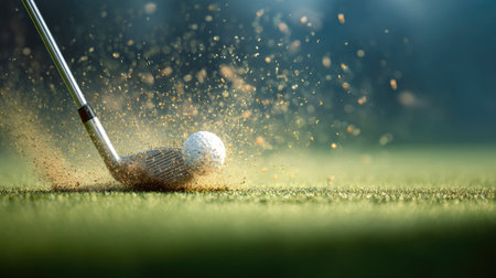 A dynamic image showcasing a golf club making contact with a ball and kicking up dust on a lush green golf course, emphasizing action and excitement in the sport.