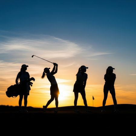 Silhouettes of women golfers standing and playing on a golf course during a vibrant sunset, capturing the essence of camaraderie and sportsmanship.