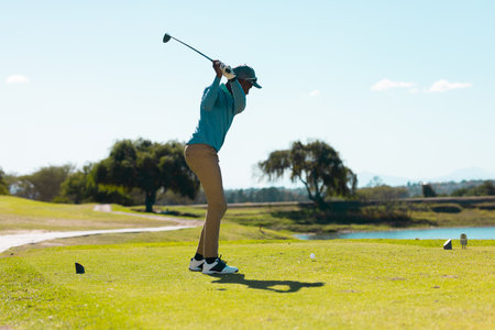 Full length of african american young man taking golf shot on grassy land at golf course against sky. copy space, summer, golf, unaltered, nature, sport and weekend activities concept.