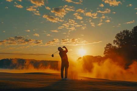 This stunning image showcases a golfer making an impactful swing at sunrise, capturing the beauty of the sport in perfect lighting amidst nature.