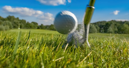 Golf club hits a golf ball. Drops of morning dew and grass particles rise into the air after the impact.