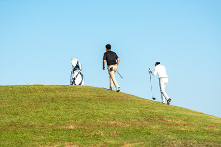 Golfer sport course golf ball fairway. Group People lifestyle man and friend playing game golf tee off on the green grass. Asia men player game shot in summer. Healthy and Sport outdoor