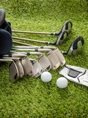 Golf equipment, sticks set in a bag glove and golfballs on green course lawn, close up vertical view. Golfing sport and club concept