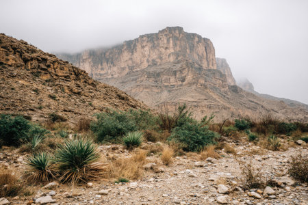 A majestic mountain range dominates the scene, its rugged surface textures contrasting with the soft, muted tones of an overcast sky. The foreground reveals dry, arid vegetation under an open composition with soft lighting. This scene suggests a remote, outdoor environment and is suitable for various commercial uses.