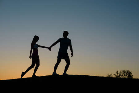 Man and woman hikers helping each other to climb a big stone at sunset in mountains. Couple climbing on a high rock in evening nature. Tourism, traveling and healthy lifestyle concept.