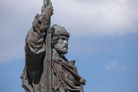 Determined Warrior in Ancient Armor Against Cloudy Sky Backdrop.