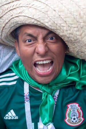Moscow, RUSSIA - June 12, 2018: Football fans arrived in Moscow for the World Cup. portraits of Mexican fans in sombrero