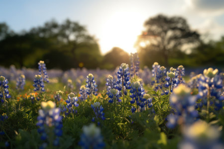 Beautiful bluebonnets blooming at sunset in Texas, USA.