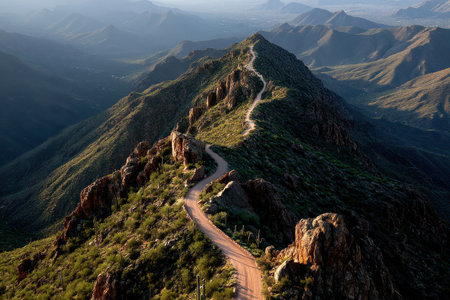 Discover a breathtaking view of a winding trail along a mountain ridge, bathed in gleaming sunlight. Enjoy the serenity of this stunning landscape.