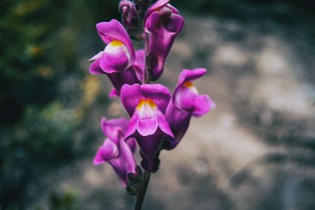 Detail of some purple flowers of antirrhinum majus on a stem in nature